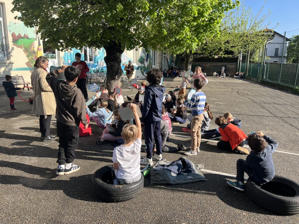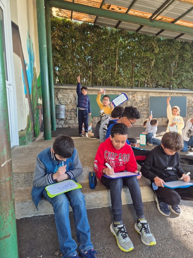 A l’occasion d’un événement inopiné, les deux classes de CM ont assisté à leur séance de calcul mental, dehors, dans la cour. Succès garanti !!