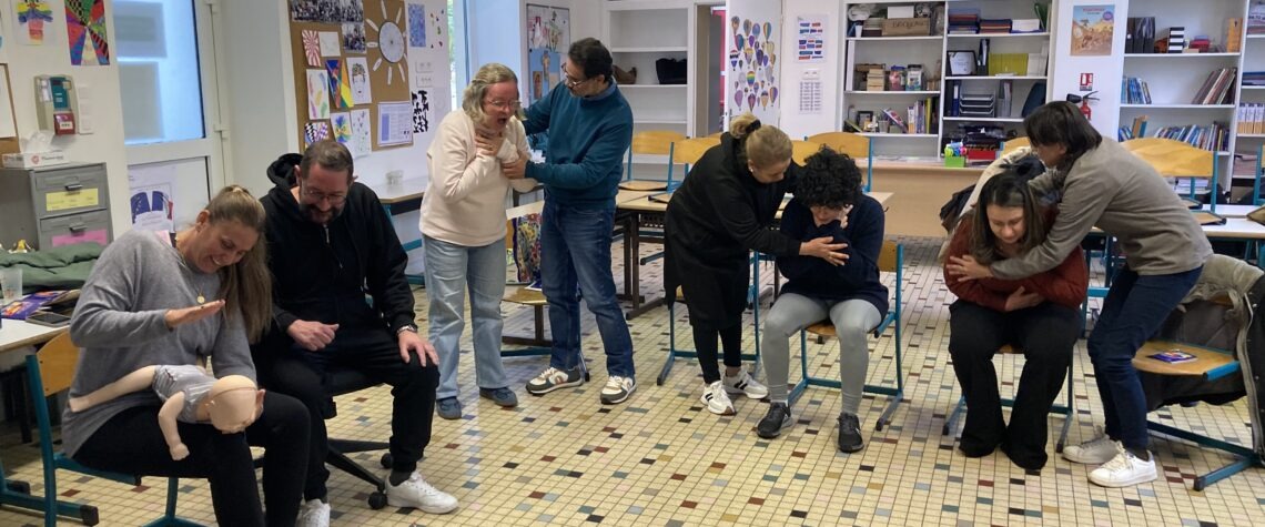 Ce mercredi, tout l’équipe (enseignants, ASEM, AESH et personnel de cantine) s’est reformée aux gestes de premiers secours.