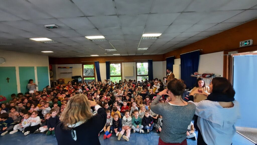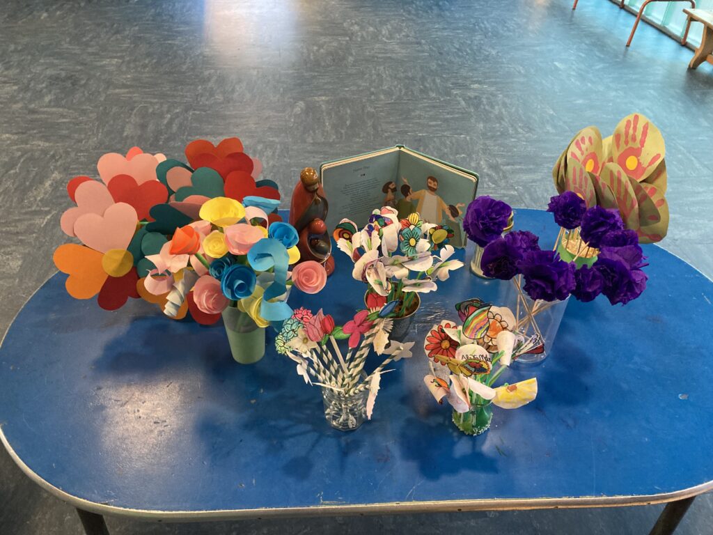 Tous les élèves de l’école se sont réunis pour célébrer le Jeudi Saint. Chaque classe avait au préalable fabriqué un bouquet de fleurs pour décorer la table et rédigé une intention à partager avec le groupe.