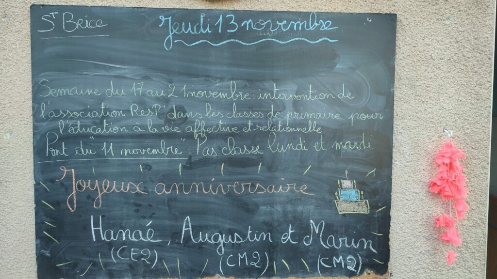 Jeudi 13 novembre 2025 – Belle fête aux Brice ! Joyeux anniversaire Hanaé (CE2), Augustin (CM2) et Marin (CM2) ! Par admin-maitresseLe 7 novembre 2025Dans Actualités générales, Tableau info