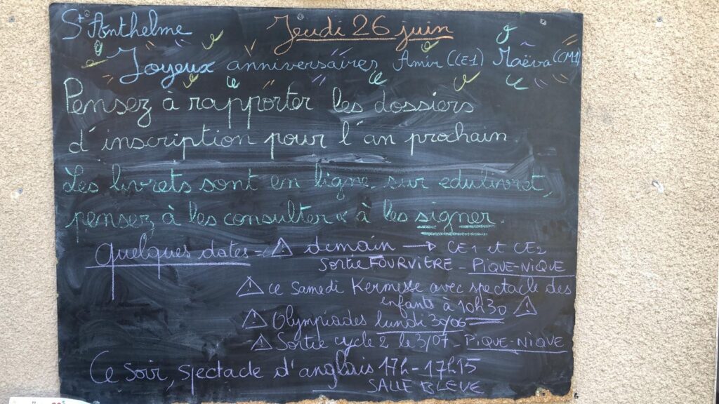 Jeudi 26 juin 2025 – Saint Anthelme ! Happy birthday to Amir (CE1) et Maëva (CM1) Par admin-maitresseLe 25 juin 2025Dans Actualités générales, Tableau info
