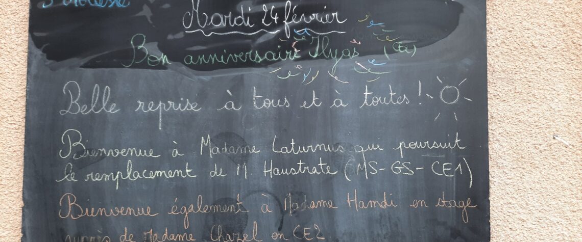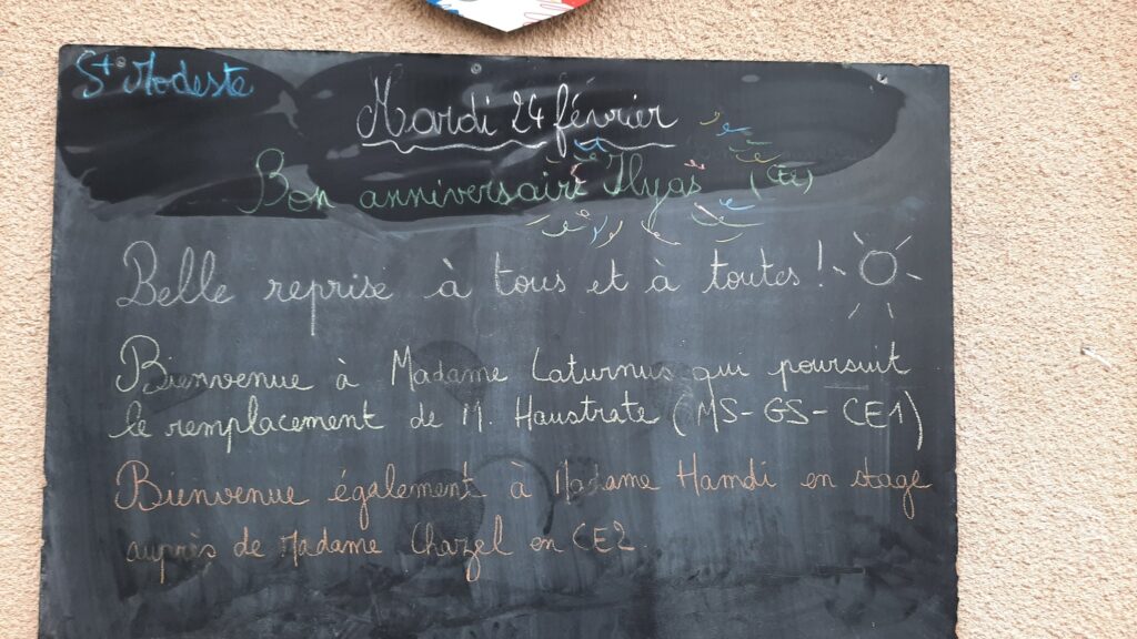 Mardi 24 février 2026 – Belle fête aux Modeste ! Happy birthday to Ilyas en CE2 ! Par admin-maitresseLe 23 février 2026Dans Actualités générales, Tableau info