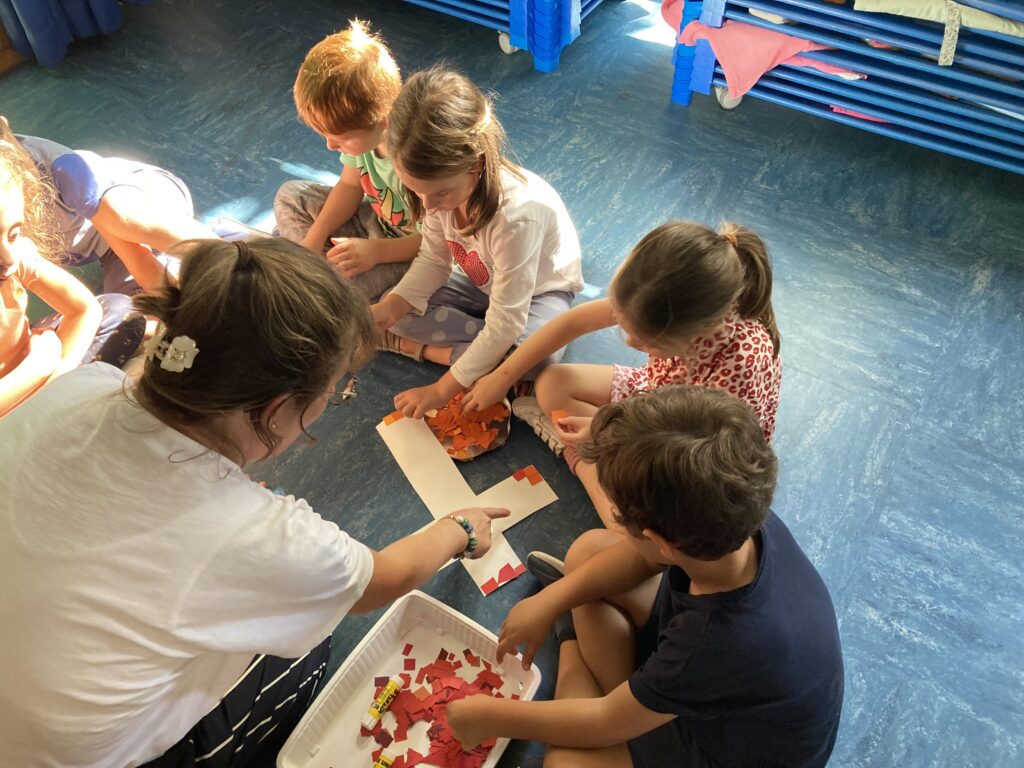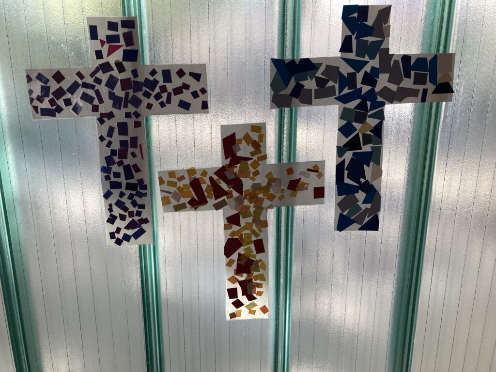 Chaque classe a décoré une croix avec des morceaux de papier type mosaïque.