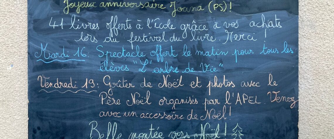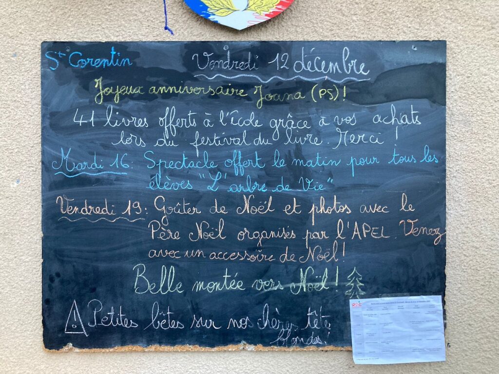 Vendredi 12 décembre 2025 – Belle fête aux Corentin ! Happy birthday to Joana en PS ! Par admin-maitresseLe 11 décembre 2025Dans Actualités générales, Tableau info