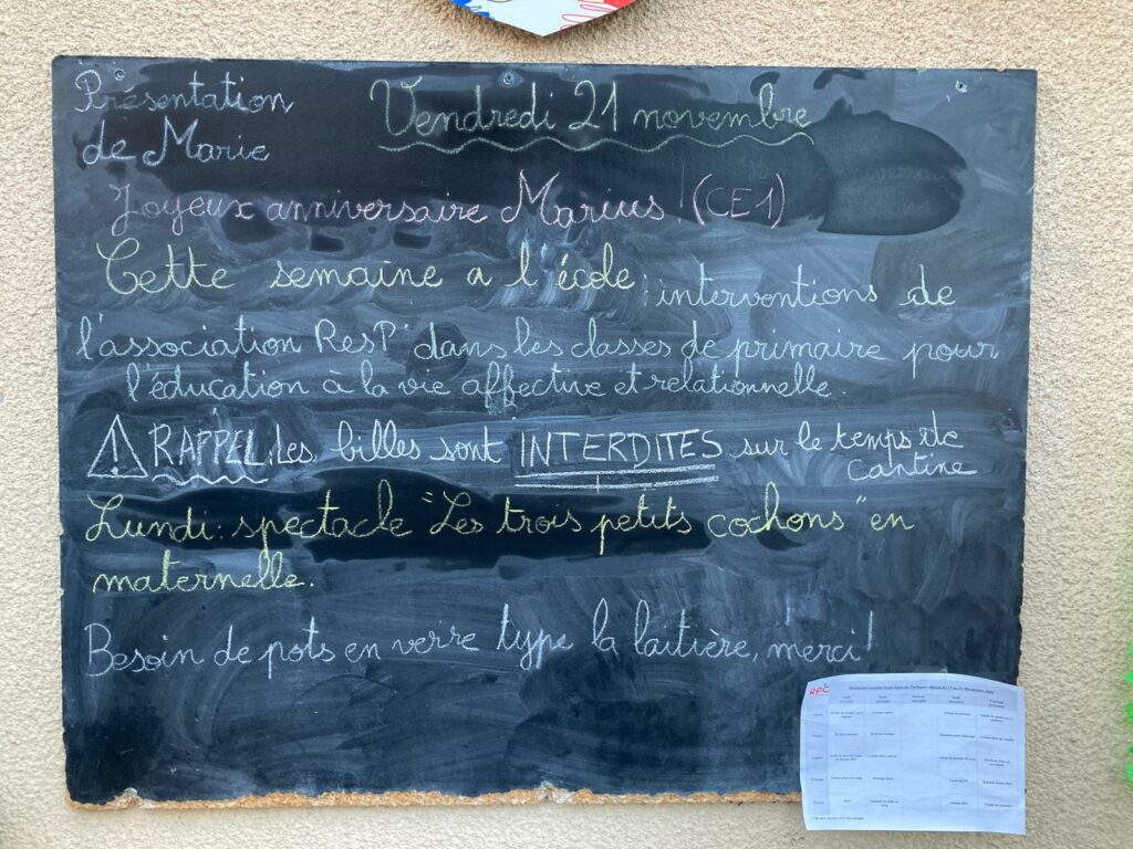 Vendredi 21 novembre 2025 – Présentation de Marie – Joyeux anniversaire Marius en CE1 ! Par admin-maitresseLe 20 novembre 2025Dans Actualités générales, Tableau info